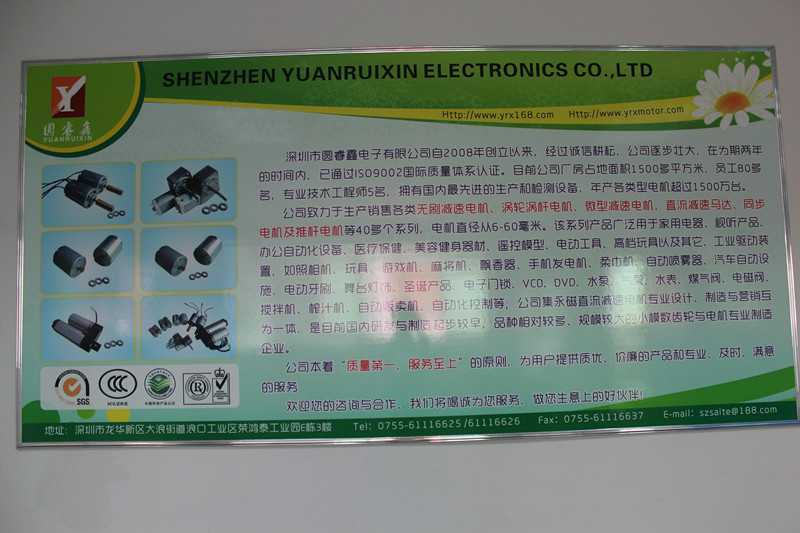 深圳市圓睿鑫電子有限公司自2008年創(chuàng)立以來,經(jīng)過誠信耕耘,在為期兩年的時(shí)間內(nèi),已通過ISO9001:2000國際質(zhì)量體系認(rèn)證。公司廠房占地面積2000多平方米,員工100人,專業(yè)技術(shù)工程師6名,擁有國內(nèi)最先進(jìn)的生產(chǎn)和檢測設(shè)備,年產(chǎn)各類減速電機(jī)超過2~300萬臺(tái)。因公司發(fā)展需要,于2020年底,將生產(chǎn)基地遷往擁有最美小鎮(zhèn)之稱的東莞市清溪鎮(zhèn),依山傍水,依托美麗的大自然環(huán)境和地方文化,全新的東莞市圓睿鑫電子有限公司將借助深圳母公司平臺(tái),一步步走上新的臺(tái)階。 東莞公司將繼續(xù)致力于生產(chǎn)銷售各類無刷減速電機(jī) 渦輪渦桿電機(jī),微型減速電機(jī),直流減速馬達(dá),交流手搖發(fā)電機(jī)、同步電機(jī)及空心杯電機(jī)等,電機(jī)直徑從6-60毫米為定位,系列產(chǎn)品廣泛用于智能家電、智能辦公自動(dòng)化設(shè)備、智能醫(yī)療、美容健身器材、遙控模型、電動(dòng)工具、高檔玩具以及其它工業(yè)驅(qū)動(dòng)裝置,如高檔玩具、游戲機(jī)、麻將機(jī)、飄香器、手機(jī)發(fā)電機(jī)、柔巾機(jī)、自動(dòng)噴霧器、汽車自動(dòng)設(shè)施、電動(dòng)牙刷、舞臺(tái)燈飾、圣誕產(chǎn)品、智能電子門鎖、VCD、DVD、水泵、氣泵、水表、煤氣閥、電磁閥、攪拌機(jī)、榨汁...